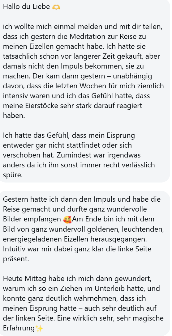 In dieser Meditation wartet eine Reise zu deinen Eizellen auf dich. Sie ermöglicht dir, Erkenntnisse über den energetischen Zustand deiner Eileiter und auch deren Durchlässigkeit zu bekommen sowie Auskünfte über den energetischen Zustand deiner Eizellen zu bekommen.