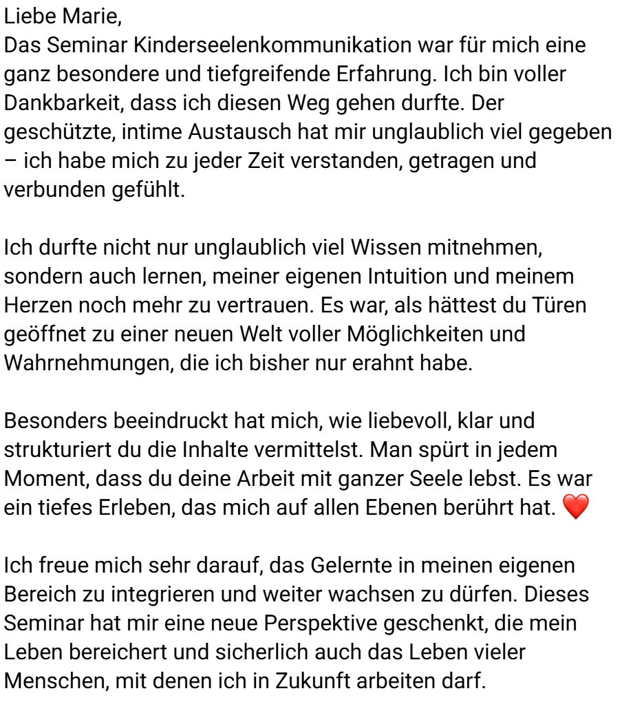 Das Seminar wird dich noch mehr zu dir selbst und deinen Fähigkeiten führen und dich vor allem darin bestärken, deinen Weg in all dem zu finden. Du wirst dich sicher und voller Vertrauen fühlen, damit aktiv und bewusst zu arbeiten. Und wenn du beim reflektieren gemerkt hast, dass du hier noch Luft nach oben hast, freue ich mich sehr, dich im Seminar begleiten zu dürfen :-)