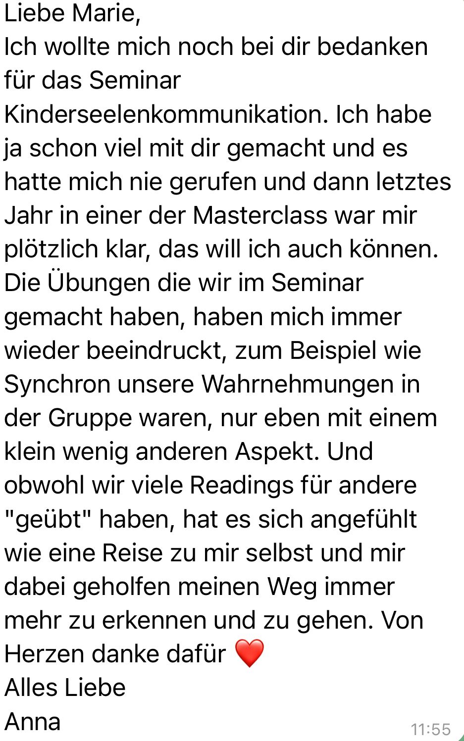 Sobald du dich bereit dazu fühlst, meldest du dich bei mir für die Abschlussprüfung. Hierbei gibst du einer Kundin, die ich mitbringe, ein Kinderseelenreading auf deine Art. Ich bin dabei an deiner Seite. Du bekommst danach ein persönliches Feedback von mir und von der Kundin.